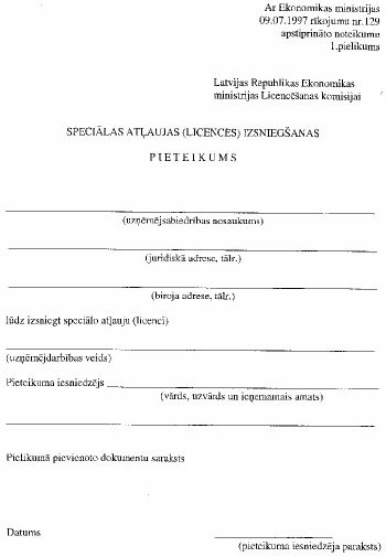 1) Ekonomikas ministrijai adresēti pieteikumi licences saņemšanai un atļaujai KIF dibināšanai (Pielikums Nr.1). Pieteikumā jānorāda visu iesniegto dokumentu saraksts un tas jāparaksta Sabiedrības valdes vai padomes locekļiem;