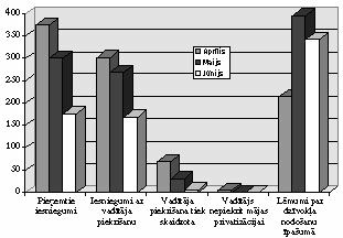 Praktisku darbu pie dzīvojamo māju sagatavošanas privatizācijai līdz š.g. 30.jūnijam uzsākušas 383 pašvaldību dzīvojamo māju privatizācijas komisijas, t.i., 68% no visām komisijām. Limbažu, Preiļu un Rīgas rajonos darbu uzsākušas visas komisijas. 95% pašvaldību privatizācijas procesā iesaistījušās Saldus rajonā, 91% - Tukuma un 81% - Balvu rajonā. Valstī kopā privatizācijas gaitā sagatavotas un nodotas privatizācijai 1121 dzīvojamā māja un 62 397 dzīvokļi. Iedzīvotāji privatizējuši 35 111 dzīvokļus, no tiem dzīvojamo māju privatizācijā 3430 dzīvokļus, bet 31 681 dzīvoklis privatizēts līdz dzīvojamās mājas privatizācijai.