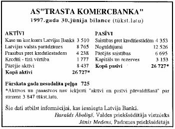 Tīrā peļņa 1997.gada 6 mēnešos ir 4.636 tūkst. latu. Šie dati atbilst informācijai, kas tika iesniegta Latvijas Bankā.
