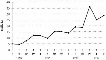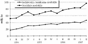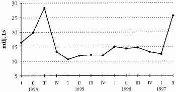 12. attēlā redzama pievienotās vērtības nodokļa ieņēmumu nevienmērība 1996. gada beigās un 1997. gada sākumā. Tā kā ar 1997. gada 1. janvāri stājās spēkā paaugstinātas akcīzes nodokļa likmes benzīnam un dīzeļdegvielai, nodokļu maksātāji pirms likmju paaugstināšanas centās ievest Latvijā degvielas krājumus. Rezultātā netiešo nodokļu ieņēmumi pirms likmju palielināšanas strauji pieauga. 1997. gada I ceturksnī degvielas imports krasi samazinājās un attiecīgi samazinājās arī nodokļu ieņēmumi. Tikai maijā un jūnijā palielinājās benzīna un dīzeļdegvielas imports.