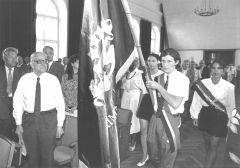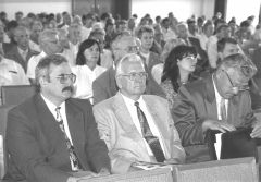 Kārļa Ulmaņa 120. dzimšanas dienas atcerei veltītā Latvijas Lauksaimniecības universitātes akadēmiskās sēdes dalībnieku vidū: zemkopības ministrs Andris Rāviņš, Latvijas zemnieku savienības priekšsēdētājs Alfrēds Greiselis, 6.Saeimas deputāts Viesturs Gredzens; sēdes zālē tiek ienests Latvijas Lauksaimniecības universitātes karogs; uz svinīgo sēdi dodas LLU rektors Voldemārs Strīķis un Valsts prezidents Guntis Ulmanis Foto: Arnis Blumbergs, “LV”
