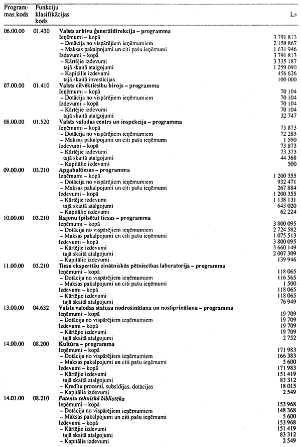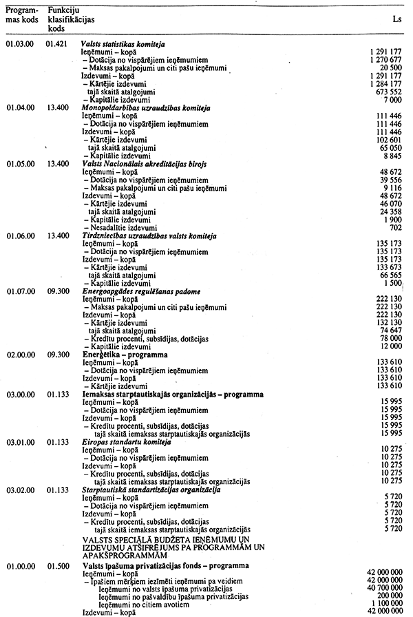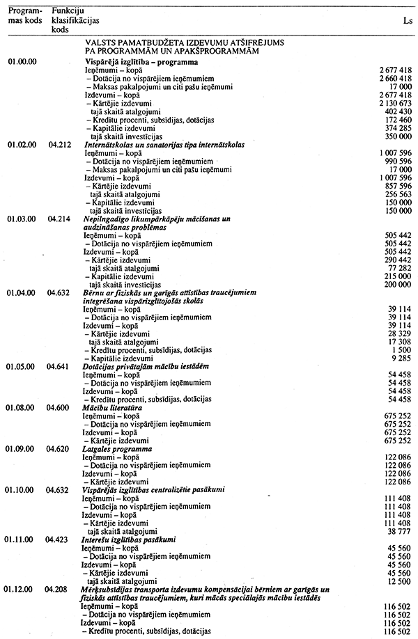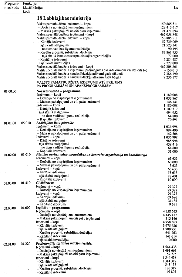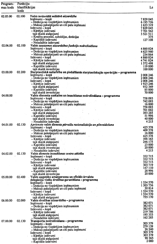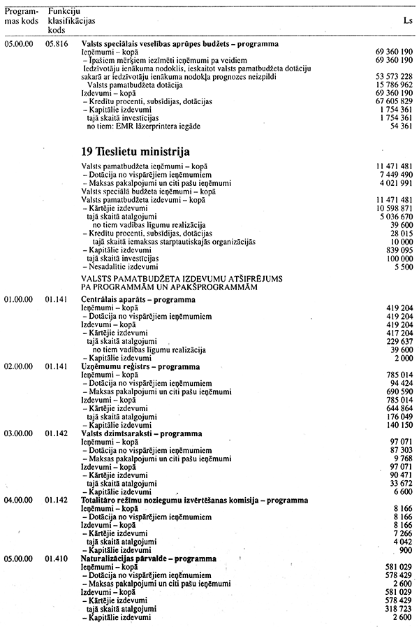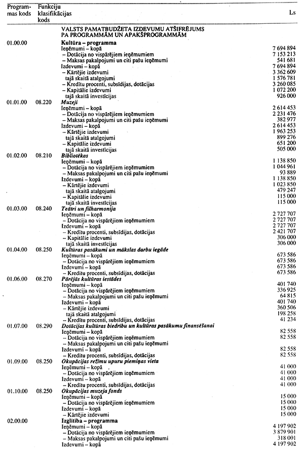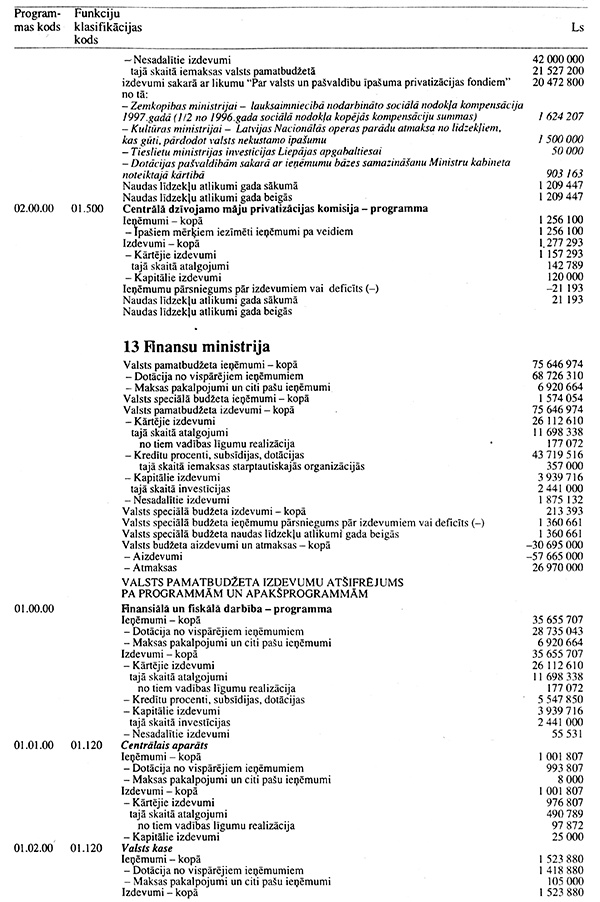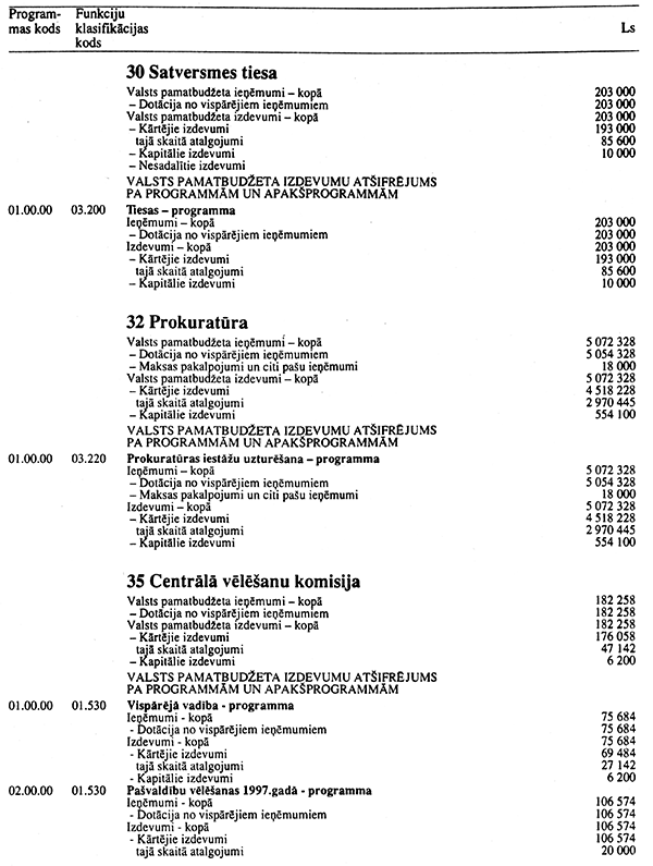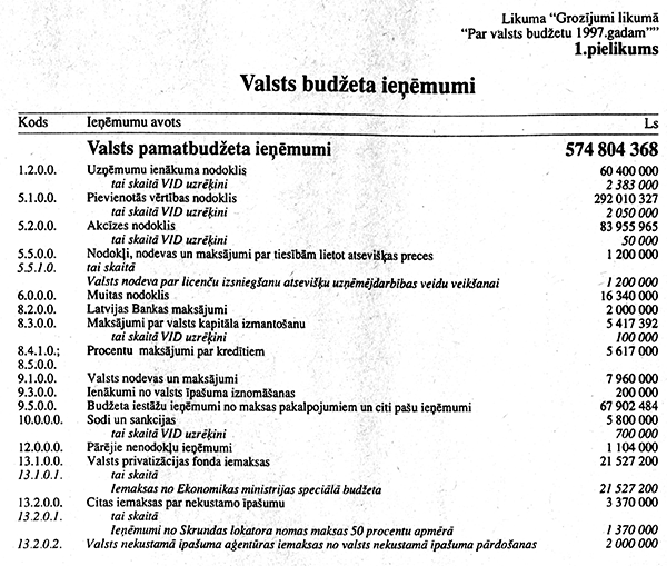"Apstiprināt valsts pamatbudžetu 1997.gadam izdevumos 574 764 457 latu apmērā, valsts pamatbudžeta ieņēmumu pārsniegumu pār izdevumiem 1997.gadā 39 911 latu apmērā un valsts speciālo budžetu izdevumos 601 813 997 latu apmērā saskaņā ar 2.pielikumu."