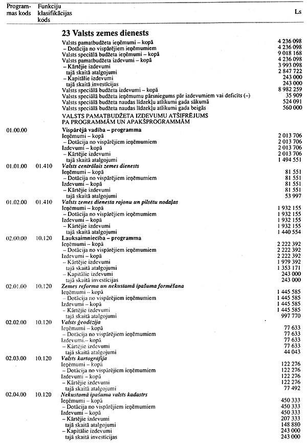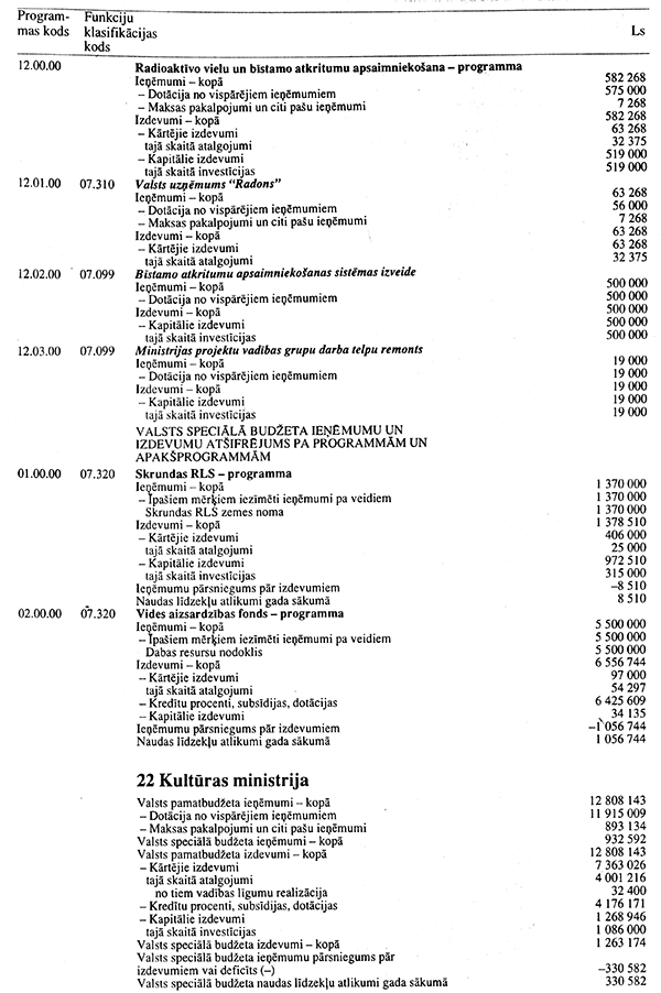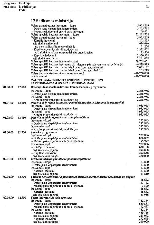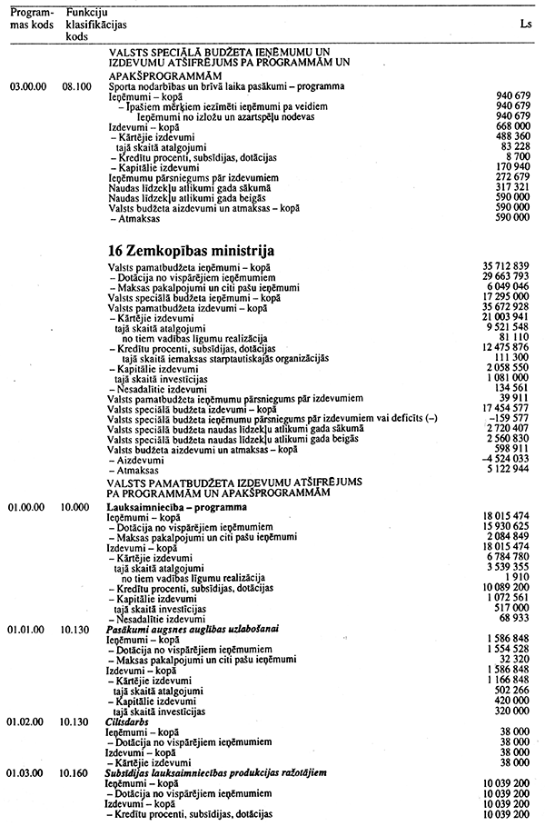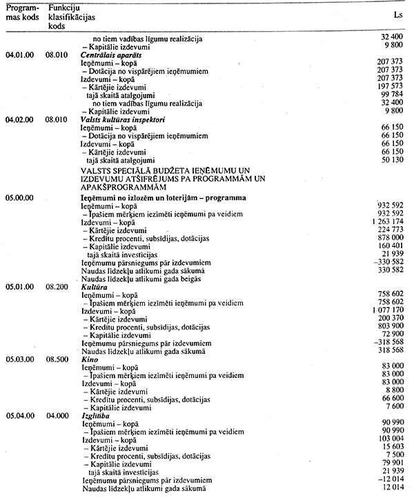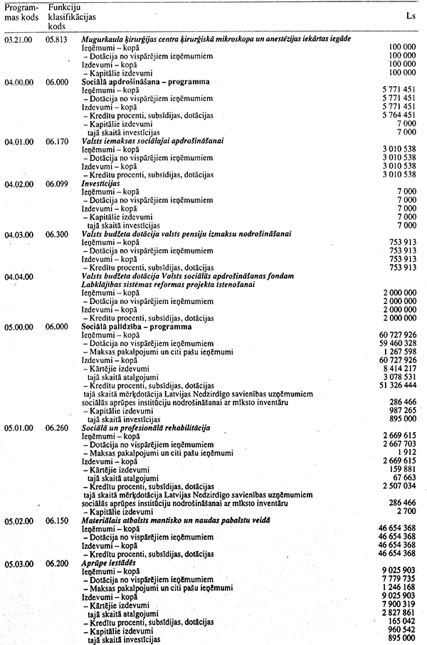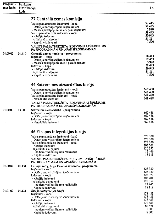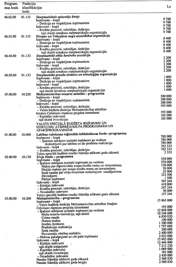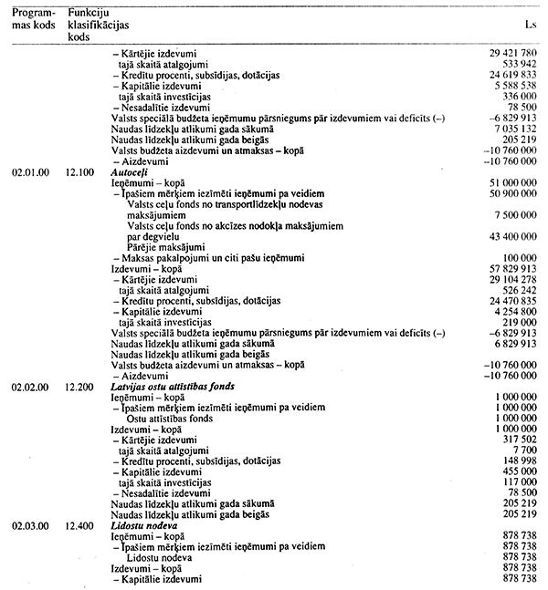 "Apstiprināt valsts pamatbudžetu 1997.gadam izdevumos 574 764 457 latu apmērā, valsts pamatbudžeta ieņēmumu pārsniegumu pār izdevumiem 1997.gadā 39 911 latu apmērā un valsts speciālo budžetu izdevumos 601 813 997 latu apmērā saskaņā ar 2.pielikumu."