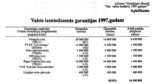 "8.pants. Noteikt maksimālo kopējo valsts parādu 498 000 000 latu apmērā, maksimālo ārējo parādu par valdības garantijām un galvojumiem 64 780 000 latu apmērā, tajā skaitā valsts izsniedzamās garantijas 1997.gadam 16 960 000 latu apmērā saskaņā ar 6.pielikumu, un valdības rīcības pieļaujamās robežas valdības saistību izpildei neparedzētu apstākļu gadījumos 12 210 000 latu apmērā."