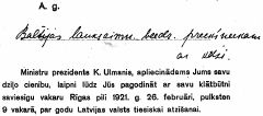 Kad Grokša kgs bija Rīgā, es viņu lūdzu ar Jums parunāties par rakstiem un cerēju kautko saņemt 1.numuram, bet nekas, es pagaidīšu otram. Tomēr lūdzu gan taču sūtīt. Jūsu K.Ulmanis