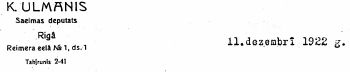 Mīļi sveicinādams, Jūsu K.Ulmanis