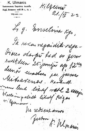 Ar mīļu sveicienu kundzei un Jums, Jūsu K.Ulmanis