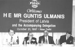21. oktobrī Deli Federācijas namā Guntis Ulmanis un Latvijas tirdzniecības un rūpniecības kameras ģenerāldirektors Voldemārs Gavars ( pa labi ) tikās ar Indijas tirdzniecības un rūpniecības federācijas kameras locekļiem
