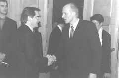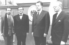 Piektdien, 31.oktobrī, Austrijas Republikas vēstniecības atklāšanā (no kreisās) — Austrijas vēstnieks Latvijā Antons Kozusniks, Austrijas vicekanclers un ārlietu ministrs Volfgangs Šisels, Latvijas Valsts prezidents Guntis Ulmanis un Latvijas ārlietu ministrs Valdis Birkavs Foto: Māris Kaparkalējs, “LV”
