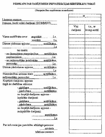 3.3. "Pārskatā par darījumiem privatizācijas sertifikātu tirgū" jāsniedz ziņas par noslēgtajiem sertifikātu pirkuma līgumiem (arī "cerību" līgumiem), kuros fiksēta cena un apjoms, neatkarīgi no tā, vai līgumi slēgti uz starpniecības uzņēmuma vai klienta rēķina, vai klienta uzdevumā.