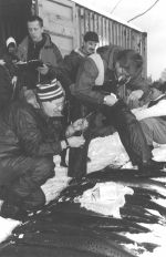 No kreisās: pētnieks Jānis Birzaks, zvejnieks Aldis Ellers un