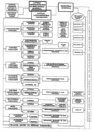 — LLMZA Prezidijs, sadarbojoties ar zinātniekiem, zinātnisko institūciju vadītājiem un Zemkopības ministrijas darbiniekiem, veica reālu zinātnisko institūtu integrāciju, iekļaušanos LLU struktūrās. Tika reorganizēti gan institūti, gan fakultātes. LLU sastāvā izveidoti deviņi institūti blakus līdzšinējiem diviem. Skrīveros un Siguldā ar Zemkopības ministrijas atvēlētiem nelieliem līdzekļiem (Ls 60 000) tika veikts remonts to pamatēkās, rekonstruēta siltumapgāde, studentiem iekārtotas viesnīcas. Aizvadītajā vasarā tajos ar labām atsauksmēm jau notika studentu prakses. Kaut zinātnisko institūciju reformas turpinās, jo turpinās privatizācijas process Viļānos, Latgales LIS, Jaunpilī, Lielplatonē, Siguldā, Krimuldā u.c., varam notikušās strukturālās reformas vispārināt. Izveidota izglītības un zinātnes struktūra, kuras kodols ir Latvijas Lauksaimniecības universitāte (shēma — pielikumā). Shēmā redzams, ka izveidoti astoņi novadu un specializētie izglītības centri, ar kuriem jānodibina cieša sadarbība. Malnavā strādās arī zinātnes nodaļa. Līdz ar to jāprecizē Latgales un pārējo reģionālo lauksaimniecības zinātnes centru nolikumi, to darbība.