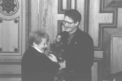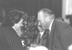 deputāte Anna Seile sniedz ziedus deputātam Elmāram Zelgalvim