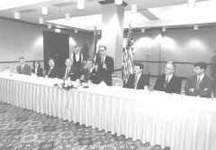 Valsts prezidents Guntis Ulmanis un Amerikas vēstnieks Lerijs Nepers — ASV uzņēmējum rīkotajās darba pusdienās Foto: Māris Kaparkalējs, “LV”