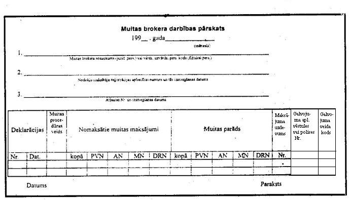 13. Pārskats (2.pielikums) par savu darbību kalendārā mēnesī muitas brokerim jāiesniedz kontroles muitas iestādē līdz nākošā mēneša 10. datumam. Ja muitas brokeris ir juridiska persona, pārskatu paraksta uzņēmuma (uzņēmējsabiedrības) vadītājs. Ja muitas brokeris ir fiziska persona, pārskatu paraksta muitas brokeris.