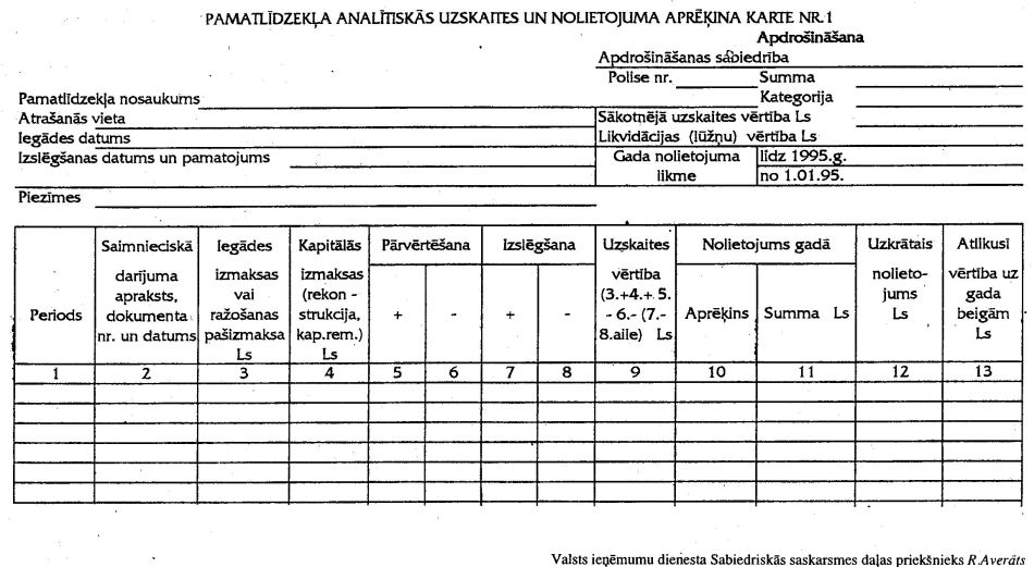 "22.2. Lai izpildītu spēkā esošajos likumos noteiktās prasības attiecībā uz informāciju, kura jāiesniedz par pamatlīdzekļiem, uzņēmumam ir jāsaglabā informācija par katru pamatlīdzekļa objektu. Katram uzņēmumam, pamatojoties uz likumiem, vispāratzītiem grāmatvedības principiem un izvēlētām metodēm, ir tiesības izstrādāt savu pamatlīdzekļu uzskaites kārtību un noteikt nolietojuma (amortizācijas) uzskaites politiku. Tomēr nodokļu vajadzībām ir jāievēro tālāk noteiktā kārtība, kā arī jāievieš noteiktās pamatlīdzekļu uzskaites kartes pa kategorijām (pielikums nr.2), katram pirmās kategorijas pamatlīdzeklim atsevišķi (pielikums nr.1), un kopsavilkuma uzskaites kartīte (pielikums nr.3) par visiem saimnieciskajā darbībā izmantotajiem pamatlīdzekļiem, kuru nolietojuma summu ņem vērā, nosakot ar nodokli apliekamo ienākumu."