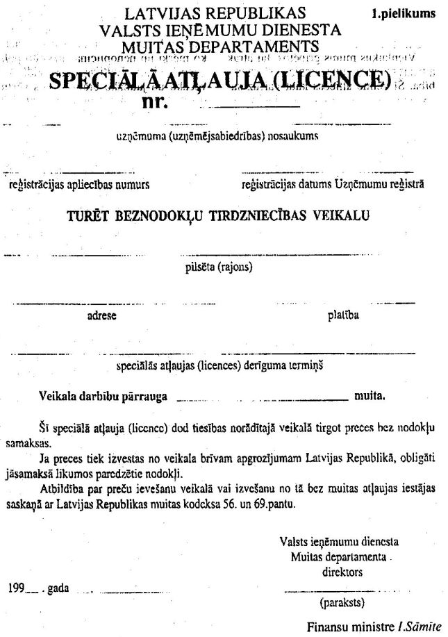 12. Veikala turēšanai tiek izsniegta noteikta parauga (1.pielikums) speciālā atļauja (licence). Lēmumu par speciālās atļaujas (licences) turēt beznodokļu tirdzniecības veikalu (tālāk tekstā — “licence”) izsniegšanu pieņem Valsts ieņēmumu dienesta izveidota komisija. Licences tiek izsniegtas konkursa kārtībā.
