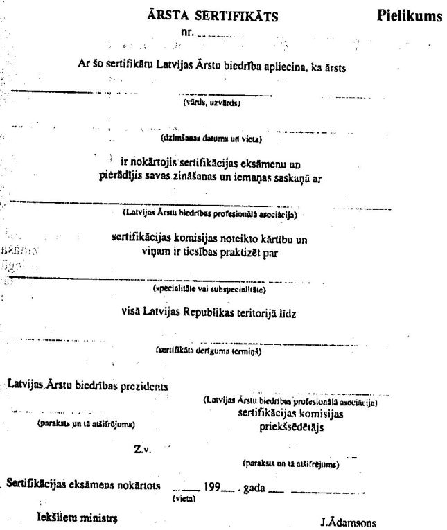 Ministru kabineta 1995. gada 4. jūlija noteikumi Nr. 187 "Noteikumi par praktizēttiesīgu ārstu sertifikāciju". Publicēts oficiālajā laikrakstā "Latvijas Vēstnesis", 12.07.1995., Nr. 104 https://www.vestnesis.lv/ta/id/35819