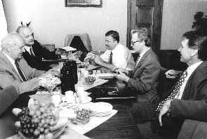 Piektdien, 28. jūlijā, valsts ekonomikas ministram Jānim Zvanītājam bija pēdējā darba diena vecajās, ierastajās telpās pirms ministrijas pārcelšanās uz jauno vietu — Brīvības ielu 55. Šajā kabinetā tika strādājuši visi pēdējo gadu saimnieciskās dzīves vadītāji, tāpēc pirms jurģiem radās doma visiem kopā pasēdēt un atcerēties, kas paveikts katra laikā. Un bija ko atcerēties — gan pieredzējušajam Miervaldim Ramānam (no kreisās), Aivaram Kreitusam, tagadējam ministram Jānim Zvanītājam, gan Arnim Kalniņam un Jānim Āboltiņam. Diemžēl Ojārs Kehris nevarēja piedalīties svarīga iemesla dēļ. Tāda kolēģu atsaucība iepriecināja un deva mūsu ekonomikas virzītājiem radošu iedvesmu turpmākajam darbam.