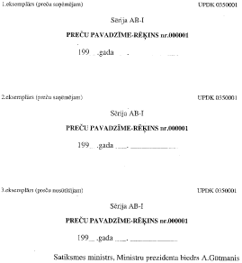 5. Pavadzīmes-rēķina veidlapu komplektu veido trīs eksemplāri (pielikums). 1. un 3.eksemplārs tiek izsniegts uzņēmumam — preču saņēmējam, bet 2.eksemplārs paliek tajā uzņēmumā, kas preces izsniedzis. Pēc preču pieņemšanas fakta apliecināšanas pavadzīmes-rēķina 1.eksemplārs nododams uzņēmuma grāmatvedībā, bet 3.eksemplārs paliek preču uzglabāšanas vietā.