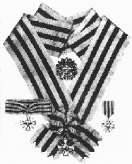 I šķira — viena plata lente pār plecu ar trim sarkanām un četrām sudraba vienāda platuma strīpām; krusts nēsājams kreisajā pusē pie lentes sasējuma; zvaigzne nēsājama kreisā pusē.