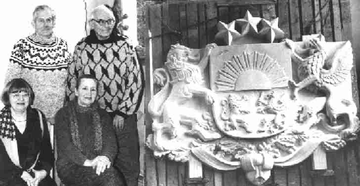 Kad tēlnieks Kārlis Zāle veidoja Rīgas Brāļu kapu ansambli, tajā iekļāvās arī vārti, ko vainagoja Latvijas ģerbonis. 1930.gadā tos pabeidza un uzstādīja. Bet 1952.gadā tautai naidīgās varas pārstāvji norāva šo mūsu svētvietas simbolu un iznīcināja arī krustus. Pērn studentu konkordija “Valdemārija” ierosināja atjaunot ģerboni un sagādāja līdzekļus, galvenokārt ziedojumu veidā. Izrādās, ka K.Zāle ir bijis šīs organizācijas goda filistrs. Pirms četrarpus mēnešiem darbu sāka pieci autori: tēlnieki Kārlis Baumanis, Ilga Zandberga, Mirdza Lukaža, Imants Lukažs un arhitekts Teodors Nigulis. Un šajās dienās ir pabeigts ģerboņa ģipša modelis dabiskā lielumā. Komisija pieņēmusi darbu un atzinusi to par precīzu un veiksmīgu. Veicamā gan vēl daudz: lielo šūnakmeni, kas atrasts Allažos, jāatved, jāsazāģē un no tā jākaļ ģerbonis. Un tad būs diena (šķiet, rudens pusē), kad atjaunotais simbols ieņems savu seno vietu Brāļu kapu vārtos. Attēlā — Mirdza Lukaža un Ilga Zandberga, Teodors Nigulis un Kārlis Baumanis.