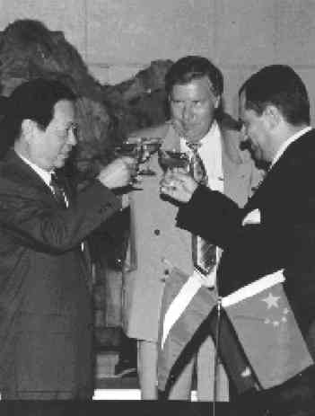 Brīdis, kas pieder vēsturei: Ķīnas Tautas Republikas un Latvijas Republikas diplomātisko attiecību atjaunošana. Peidžina, 1994. gada 28. jūlijs. No kreisās: ĶTR premjerministra vietnieks ārlietu ministrs Cjans Cičeņs, Latvijas goda konsuls Beļģijā Nils Dālmans un Latvijas delegācijas vadītājs Māris Gailis.