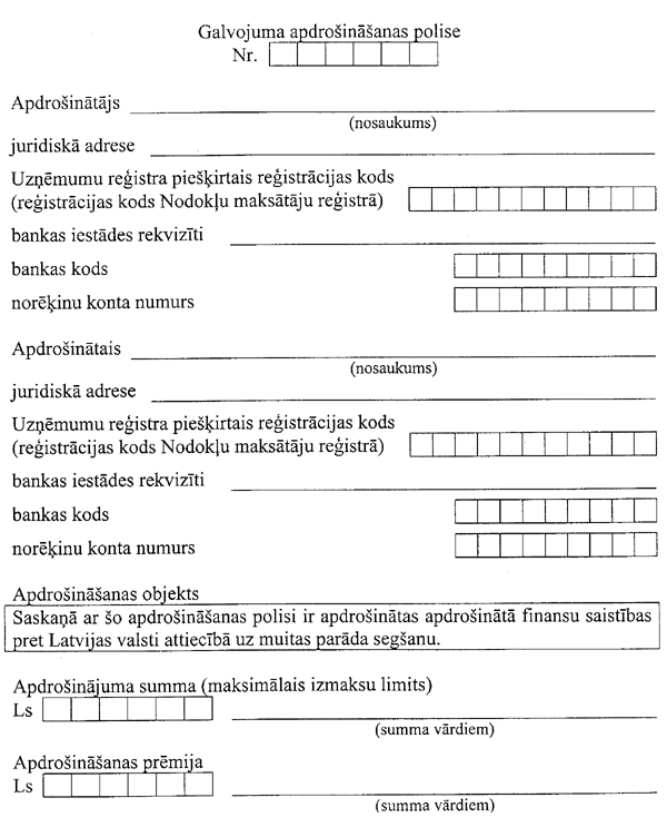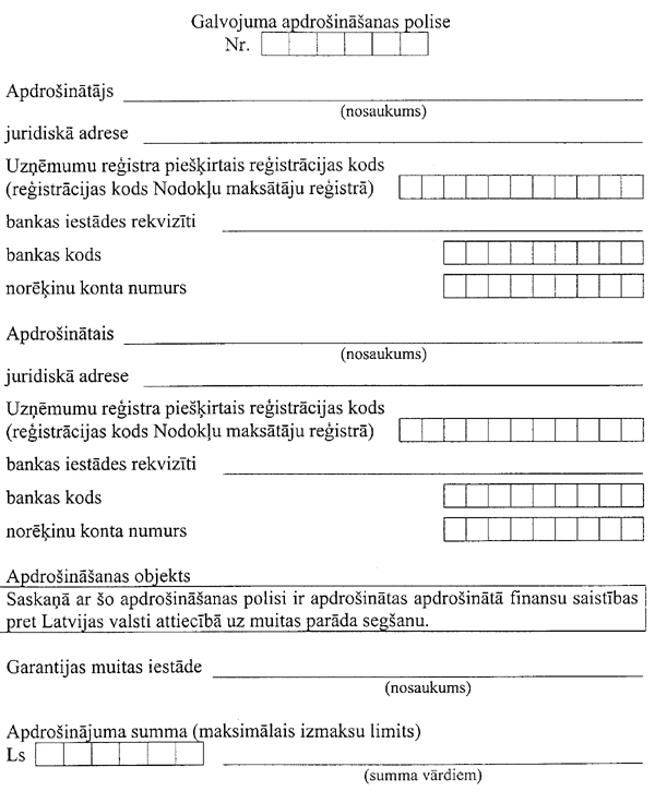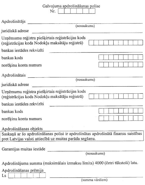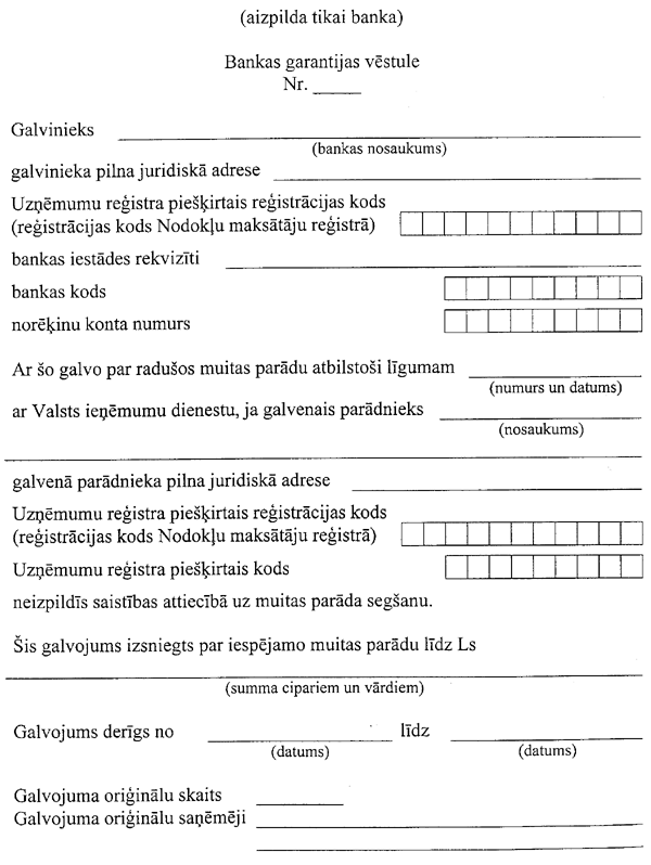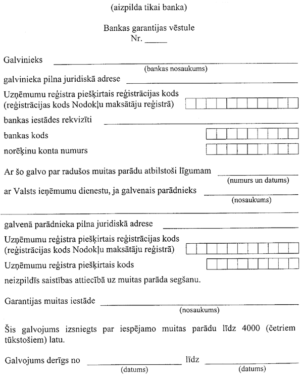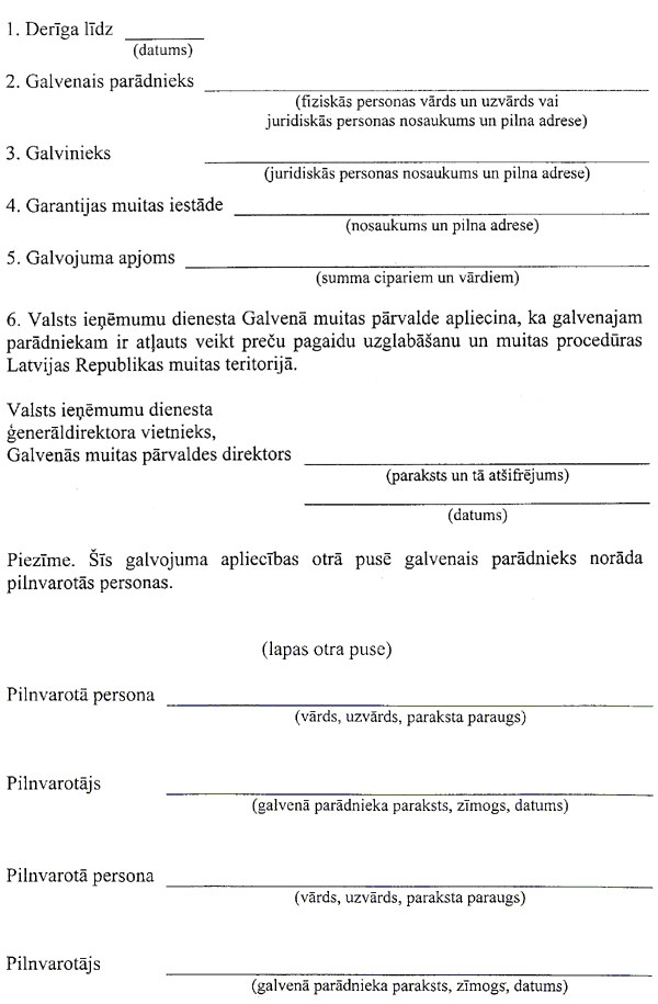 38. Vienreizējo galvojumu piemēro, lai vienu reizi nodrošinātu preču pagaidu uzglabāšanu vai veiktu vienu muitas procedūru. Vienreizējā galvojuma apjoms atbilst pilnai muitas maksājumu summai, kas būtu jāmaksā, izlaižot preces brīvam apgrozījumam (5. un 6.pielikums). Tam var būt noteikta likme — 4000 latu par katru muitas deklarāciju vai pirmsmuitošanas dokumentu (7. un 8.pielikums). Ja muitas parāds vai iespējamais muitas parāds pārsniedz noteikto likmi, attiecīgi palielina vienreizējo galvojumu (ar noteiktu likmi) skaitu.