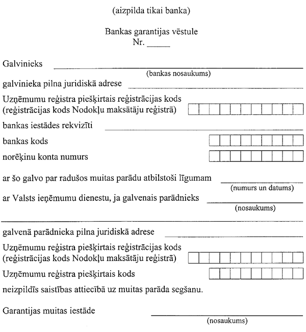 11. Galvinieka statusu banka iegūst, ja tā ar Valsts ieņēmumu dienestu noslēdz līgumu, kurā ir noteikts, ka attiecīgā banka apņemas pēc Valsts ieņēmumu dienesta rakstiska pieprasījuma 30 dienu laikā veikt visus līgumā noteiktos maksājumus galvenā parādnieka muitas parāda segšanai.