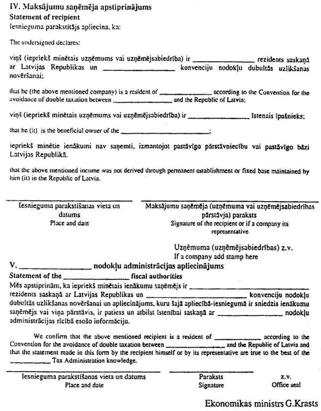3. Ja izmaksātājs nerezidentam (turpmāk tekstā — “maksājumu saņēmējs”) izmaksā attiecīgos maksājumus un starptautiskajā līgumā ir noteikta šo maksājumu aplikšana ar nodokli (nodokļa ieturēšana) pēc samazinātas likmes vai ir atbrīvojums no aplikšanas ar nodokļiem (nodokļu ieturēšanas) Latvijas Republikā, maksājumu saņēmējam pirms maksājumu izmaksas jāiesniedz izmaksātājam aizpildīta noteikta parauga rezidenta apliecība–iesniegums nodokļu atvieglojumu piemērošanai (1.pielikums). Minētajā apliecībā–iesniegumā jābūt maksājumu saņēmēja rezidences valsts kompetentas iestādes (nodokļu administrācijas) apstiprinājumam, ka maksājumu saņēmējs ir attiecīgās valsts rezidents saskaņā ar Latvijas Republikas un šīs valsts konvenciju nodokļu dubultās uzlikšanas novēršanai. Šajā gadījumā izmaksātājs nodokļus no maksājumiem ietur saskaņā ar starptautiskā līguma noteikumiem.