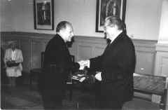 Attēļā: Akadēmiķis Jānis Stradiņš sveic profesoru Teodoru Zeidu 80 gadu jubilejā 1992.gada 1.augustā.