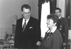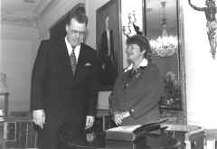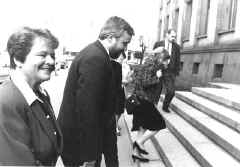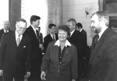Attēlos: Norvēģijas Karalistes premjerministres Grū Hārlemas Bruntlandes vakardienas gaitas Latvijas zemē —tiekoties ar Valsts prezidentu Gunti Ulmani un Ministru prezidentu Andri Šķēli, Ministru prezidentam sagaidot augsto viešņu pie Valdības nama.