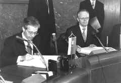 Latvijas ārlietu ministrs Valdis Birkavs paraksta līgumu; vizītē
