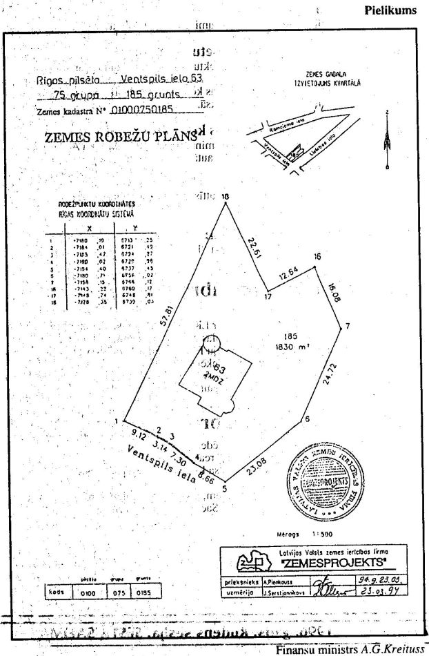 1. Saskaņā ar likumu “Par zemes reformu Latvijas Republikas pilsētās” (oficiāls izdevums AP MP, 1991, 14.nr.; Latvijas Republikas Augstākās Padomes un Valdības Ziņotājs, 1993, 18./19.nr.; Latvijas Vēstnesis, 1994, 47., 145.nr.; 1995, 169.nr.; 1996, 5., 131.nr.) pārdot zemes gabalu (zemes kadastra nr. 0100 075 0185) 1830 m2 kopplatībā Rīgā, Ventspils ielā 63 (pielikums), kas reģistrēts zemesgrāmatā uz valsts vārda Finansu ministrijas personā, ēkas pašreizējam īpašniekam sabiedrībai ar ierobežotu atbildību “Aeronavigācijas Serviss” (reģistrācijas apliecības nr. 000318923, reģistrēta 1994.gada 5.aprīlī) — ēkas uzturēšanai. Attiecīgā zemes gabala pārdošanas cena nedrīkst būt zemāka par tā kadastrālo vērtību.