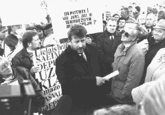 Attēlos: sarunās ar piketētājiem — arī Valsts prezidents Guntis Ulmanis, Ministru prezidents Andris Šķēle, Ministru prezidenta biedrs Ziedonis Čevers un tieslietu ministrs Dzintars Rasnačs.