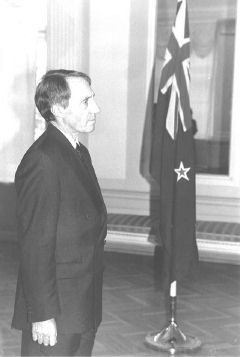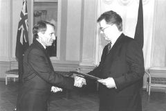 — Jūsu ekselence, atļaujiet man jūs apsveikt kā Jaunzēlandes ārkārtējo un pilnvaroto vēstnieku Latvijā. Mēs ceram, ka Jaunzēlandes vēstnieka akreditācija Latvijā turpinās to sadarbību, kas jau ir izveidojusies starp mūsu valstīm. Mūsu valstis ģeogrāfiski šķir kilometru tūkstoši, bet vieno kopīgi demokrātijas ideāli. Latvija ir raudzījusies uz Jaunzēlandi kā uz brīvības un demokrātijas modeli. Jaunzēlandē patvērumu ir atraduši vairāki simti vēsturisko kolīziju rezultātā pasaulē aizklīdušo latviešu. Vērā ņemams un augstu novērtējams ir progress, ko Jaunzēlande veikusi savā radikālajā ekonomiskajā reformā.