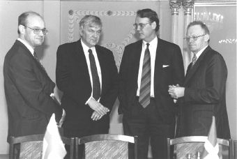 Latviešu valodas apguves valsts programmu paraksta izglītības un zinātnes ministrs Māris Grīnblats, ārlietu ministrs Valdis Birkavs un ANO Attīstības programmas pastāvīgais pārstāvis Džons Hendra; sarunās Zviedrijas vēstnieks Hanss Magnusons, Somijas vēstnieks Hannu Hemeleinens, ANO Attīstības programmas pastāvīgais pārstāvis Džons Hendra un Latvijas ārlietu ministrs Valdis Birkavs____________ Foto: Māris Kaparkalējs, “LV”