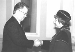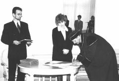 Vakar, 9.decembrī, Rīgas pilī notika Satversmes tiesas tiesnešu zvēresta nodošanas ceremonija. Saeima ir apstiprinājusi sešus tiesnešus. Valsts prezidentam zvērestu nodeva: Romāns Apsītis, Ilma Čepāne (kopainā un apakšējā attēlā pa labi), Anita Ušacka, Aivars Endziņš (kopainā un apakšējā attēlā pa kreisi). Savukārt Andrejs Lepse un Ilze Skultāne piedalījās svinīgajā ceremonijā, tomēr zvērestu nedeva, jo ir to jau devuši, stājoties tiesneša amatā citā tiesā. Pieņemot svinīgo zvērestu, Valsts prezidents uzsvēra, ka Satversmes tiesas izveidošana ir būtisks solis Latvijas demokrātijas attīstībā. “Tā ir neatkarīgas tiesu varas augstākais vainagojums,” teica G.Ulmanis. Valsts prezidents runāja par to, ka Satversmes tiesas institūcija sekmē Latvijas tiesību sistēmas tuvināšanos Eiropai. Prezidents un tieslietu ministrs Dzintars Rasnačs (apakšējā attēlā pa kreisi) novēlēja tiesnešiem, pildot sava amata pienākumus, atrast pareizos risinājumus, pareizo pieeju un izpratni un stingri ievērot Latvijas Republikas Satversmes garu un būtību.________ Prezidenta preses dienests. Foto: Arnis Blumbergs, “LV”
