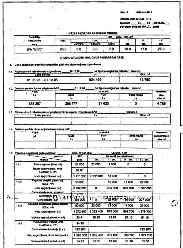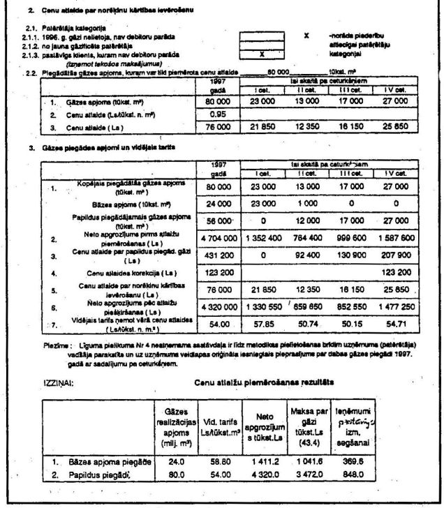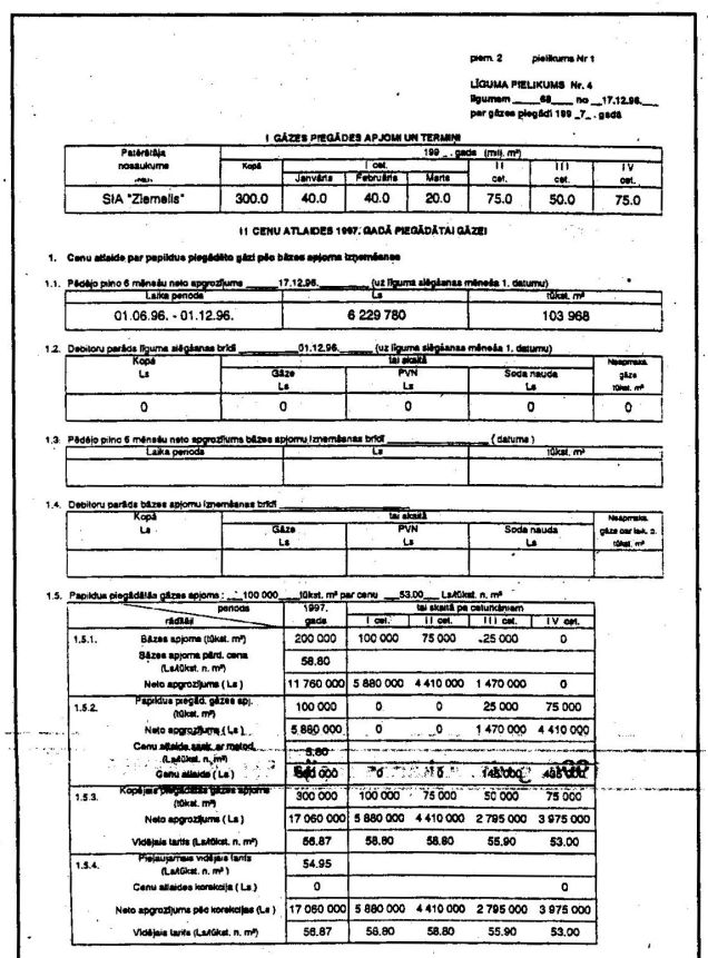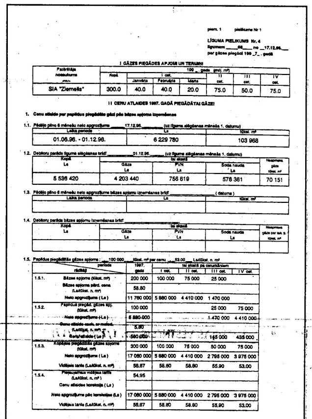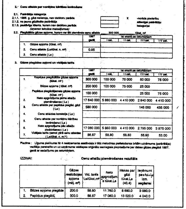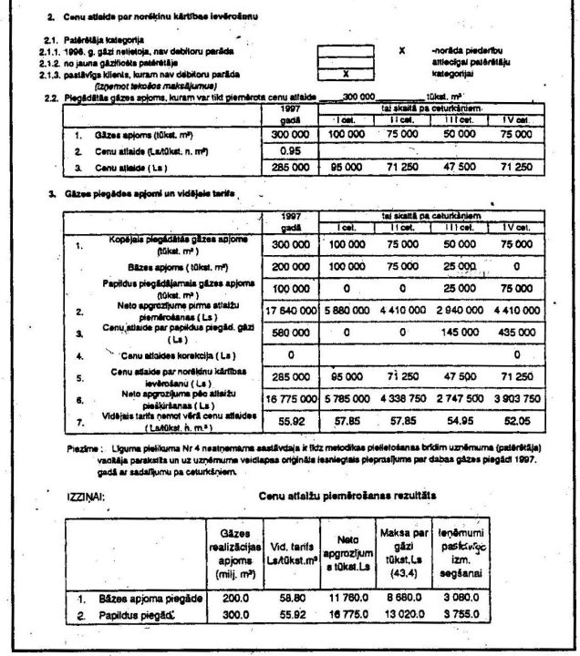 2. Bāzes apjoms - rūpnieciskā patērētāja, kurš gāzi lietoja 1996.gadā uzņēmuma (patērētāja) vadītāja parakstīts un uz uzņēmuma veidlapas oriģināla iesniegtais pieprasījums par dabas gāzes piegādi 1997.gadā ar sadalījumu pa ceturkšņiem.