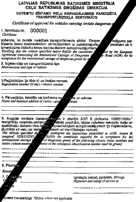 2. Apstiprināt klāt pievienoto Noteiktu bīstamo vielu pārvadājumiem paredzēta transportlīdzekļa sertifikāta paraugu (2. pielikums).