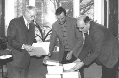 Dāvinājuma reizē: 1.attēlā — Cēsu Valsts ģimnāzijas direktors Jānis Endele, “Latvijas Vēstneša” procesa direktors Kārlis Grīnbergs un redaktoru korpusa vecākais Andris Sproģis; 2.attēlā — ģimnāzijas direktors un “Latvijas Vēstneša” īpašu uzdevumu redaktors Mintauts Ģeibāks.
