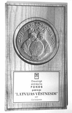 Tajā pašā reizē Draudzīgā aicinājuma fonda vārdā Jānis Endele redakcijai pasniedza Piemiņas medaļu (3. attēlā), kas atgādina Cēsu Draudzīgā aicinājuma Valsts ģimnāzijas būtību un statusu. Pateicoties par pilnīgi negaidīto uzmanības zīmi, “Latvijas Vēstnesis” apliecina savu uzticību Draudzīgā aicinājuma idejai arī turpmāk.