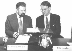 Pēc līguma parakstīšanas Vladimirs Makarovs pasniedza Džonam Hendram Labklājības ministrijas atzinības rakstu (attēlā pa kreisi), atzīmējot viņa nopelnus ANO Attīstības programmas (UNDP) īstenošanā Latvijā.