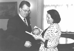 Inese Pētersone pasniedzot grāmatu Valsts prezidentam Guntim