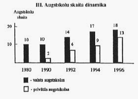 - Vispirms, statistiski salīdzinot 1996./97.mācību gadā imatrikulēto studentu (to, kuri uzsāka mācības pirmajā kursā, - red.) skaitu, jāatzīmē, ka no 19001 jaunā studenta privātajās augstskolās ir nedaudz vairāk kā desmitā daļa - 1953. Tomēr privātās juridisku personu dibinātās augstskolas ir radījušas veselīgu konkurenci valsts augstskolām, kurās viena otra studiju programma izrādījusies pārāk konservatīva. Privātaugstskolu pašreizejās attīstības tendence rāda, ka sabiedrība pieprasa plašākas iespējas apgūt biznesa studijas. Acīmredzot valsts augstskolas šādai pastiprinātai interesei nebija gatavas, tāpēc ir labi, ka šiem studentiem ir radusies vieta, kur mācīties. Te gan jāpiebilst, ka studēšana privātaugstskolās izmaksā no 800 līdz 1000 latiem gadā.