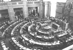 Latvijas Valsts prezidents Guntis Ulmanis Dānijas premjerministra Pola Nīrupa Rasmusena un Lones Dibkjeras kundzes rīkotajās pusdienās Kristianborgas pilī 1997.gada 20.martā: