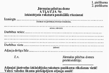 4.4. Pamatojoties uz 4.1. vai 4.2. punktā noteiktajā kārtībā iesniegtajiem dokumentiem un čeku par nodevas nomaksu, domes komercnodaļa izsniedz dokumentu, kas apliecina tiesības rīkot izklaidējoša rakstura pasākumus publiskās vietās Jūrmalas pilsētā — “Atļauju izklaidējoša rakstura pasākumu rīkošanai” (1. pielikuma 2. pielikums).