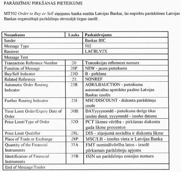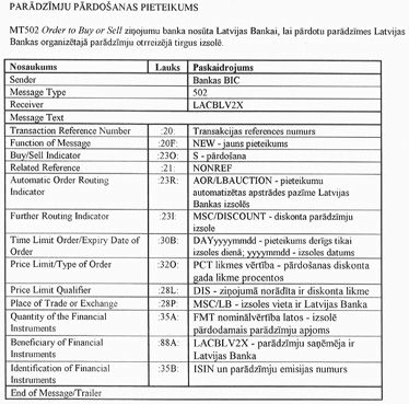 2.2. Lai piedalītos izsolē, banka izsoles dienā pa elektronisko datu pārraides sistēmu S.W.I.F.T. nosūta Latvijas Bankai izsoles parādzīmju pārdošanas (1. pielikums) vai pirkšanas (2. pielikums) pieteikumu. Pieteikumā pēc bankas izvēles norāda attiecīgo izsoles numuru, tās piedāvāto vai pieprasīto parādzīmju emisijas numuru, nominālvērtību apjomu un gada diskonta likmi.
