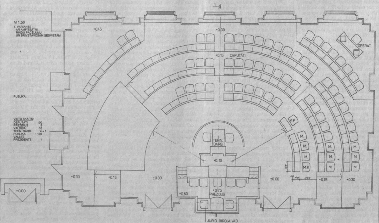 Jā, patiešām, darbu izmaksas būs diezgan lielas — apmēram 500—600 tūkstoši latu. Tajos ietverti visi izdevumi, kas saistīti gan ar zāles restaurāciju, gan ar jaunu mēbeļu iegādi, gan ar tehnisko aprīkojumu. Šie līdzekļi jau bija atvēlēti šā gada valsts budžeta likumā. Lai visu paveiktu, bija vajadzīgi trīs konkursi. Konkurss par elektronisko iekārtu uzstādīšanu notika jau pagājušajā gadā. Tajā uzvarēja Vācijas firmas “Amtown Sound” Latvijas filiāle, kas galvenokārt izmantos pasaulē labi pazīstamās firmas “Philips” tehniku. Bet pašlaik risinās vēl divi konkursi — par mēbeļu (galdu, krēslu, sienu apdares materiālu) piegādi un par zāles kapitālo rekonstrukciju un pārbūvi. Tiks kapitāli pārveidota zāles grīda, ievērojot projektēto dažādo tās augstuma līmeni, atjaunos arī visus griestus, lustras. Konkursu komisijas priekšsēdētājs ir Saeimas Kancelejas direktora vietnieks Valdis Ziemelis. Konkursi vēl nav beigušies. Pašlaik ļoti intensīvi strādājam pie to rezultātu izvērtēšanas un apkopošanas. Apbraukājam kandidējošās firmas, iepazīstoties ar to iespējām kvalitatīvi un laikā paveikt visus darbus. Līdz aprīļa beigām mums jāpieņem lēmums par divām piemērotākajām firmām mēbeļu izgatavošanas un zāles restaurācijas darbos. Piebilstams, ka abos konkursos piedalās tikai Latvijas firmas. Kritēriji ir ļoti stingri — uzskatām, ka, piemēram, mēbelēm jābūt ar vismaz 100 gadu izturību. Tas pats attiecas uz elektronisko sistēmu, lai pēc kāda laika atkal nebūtu jāatgriežas pie remontdarbiem.