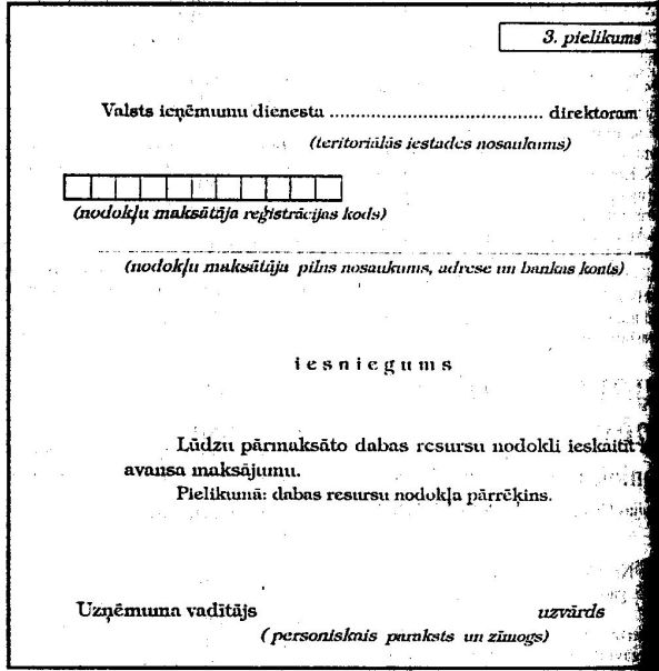 • iesniegumu par pārmaksāto dabas resursu nodokļa ieskaitīšanu avansa maksājumos, kas noformēts pēc parauga 3.pielikumā;